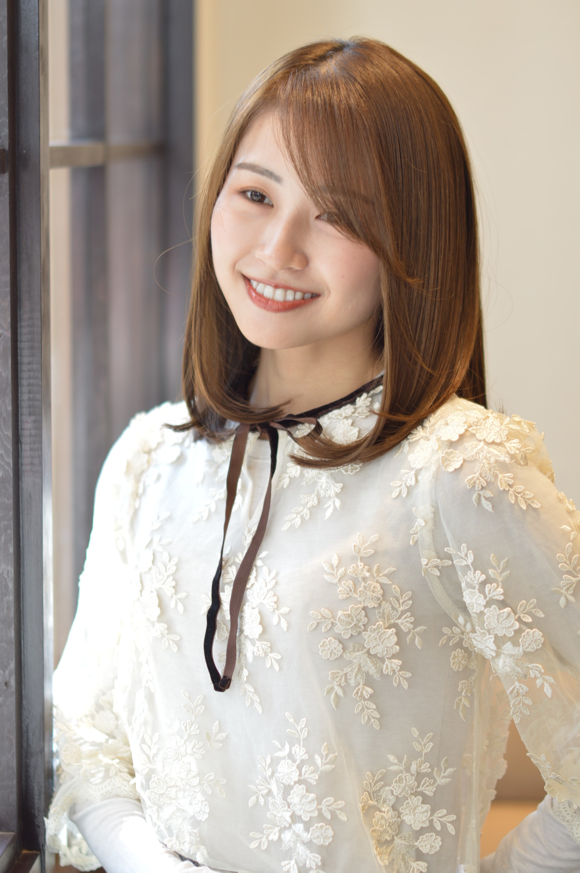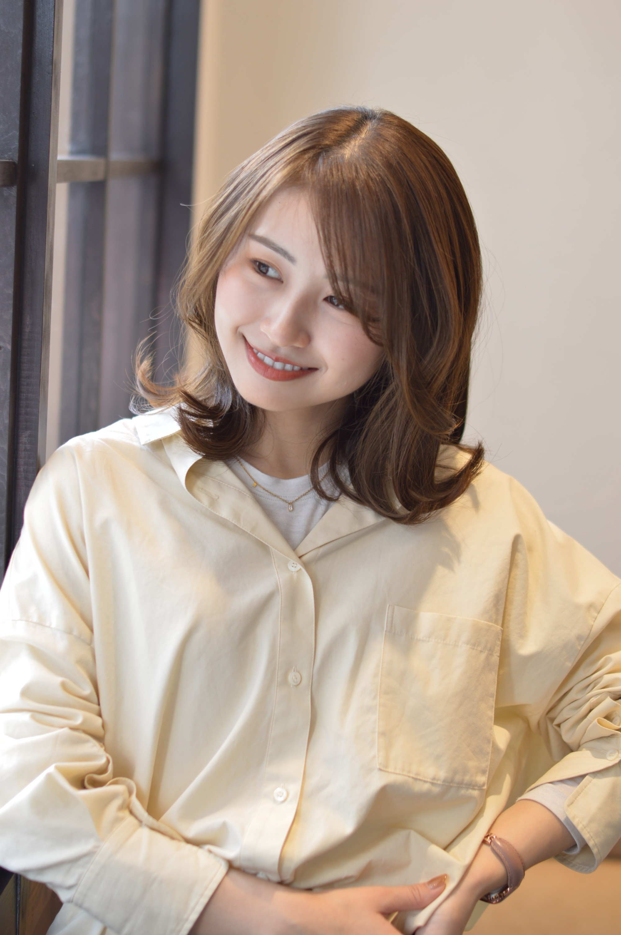 バングも短すぎない斜めバングで女性らしく柔らかい印象になる様に。
