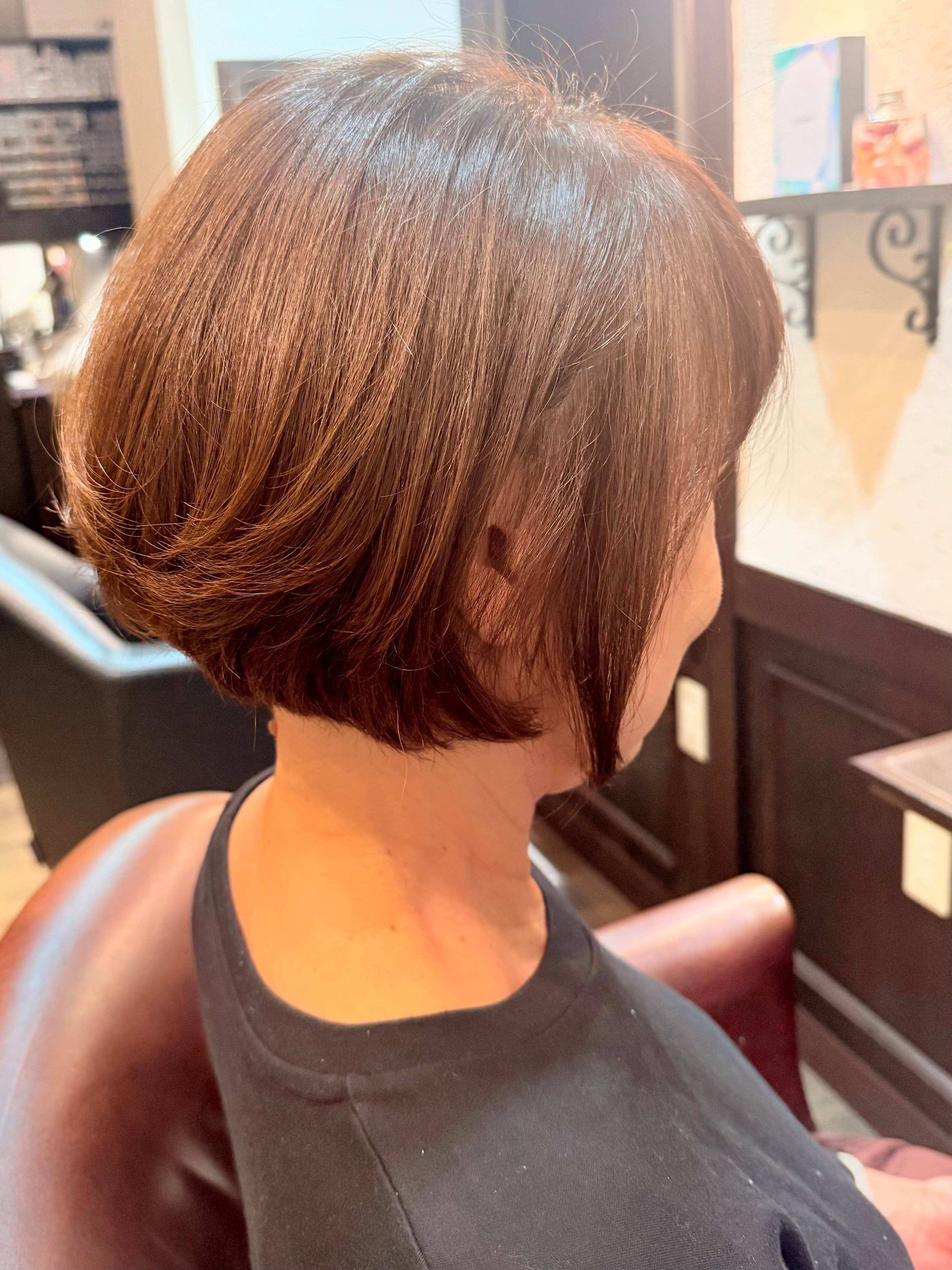 今回のテーマであった白髪を染める、若く見えるように、手入れが楽っていう事でしたので前髪は作ろうと思ってたので斜めバングで!